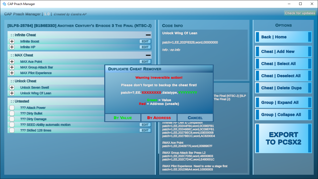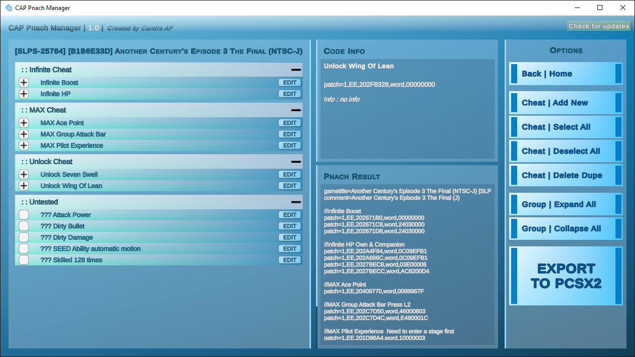 - Select the cheat you want and click "EXPORT TO PCSX2".